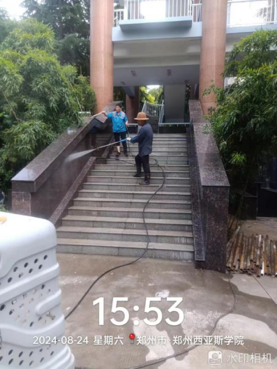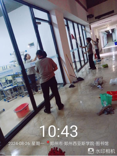 十五、对校园环境进行了1-10号楼楼梯冲洗清洁、CUBA除胶及玻璃清洁、北4北5发书现场清洁、地面冲洗、水系打捞、落叶清理、行政楼1-2层清洁、消杀等工作。