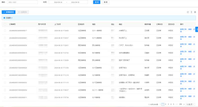 二、08月24日-08月30日17:30,客服部共接到2899条报修并及时安排人员处理。