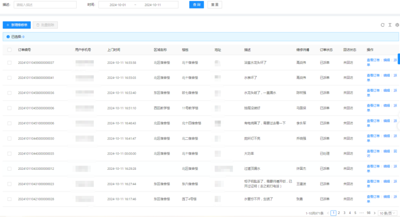 一、10月01日-10月11日17:00,客服部共接到971条报修并及时安排人员处理。