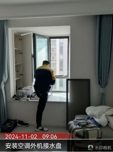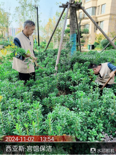 十三、宫馆项目开展了配合施工方安装空调外机接水盘、空调外机接水盘抽检、保洁水龙头维修、烟感报警设备检查、公区卫生保洁、园区有害植物拔除、售楼部外侧卫生打扫、张贴装修许可证等工作。