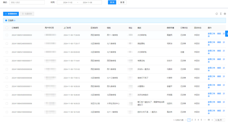 一、11月02日-11月08日17:30,客服部共接到873条报修并及时安排人员处理。
