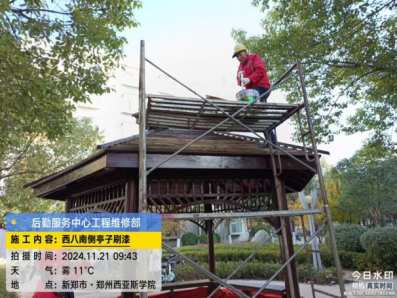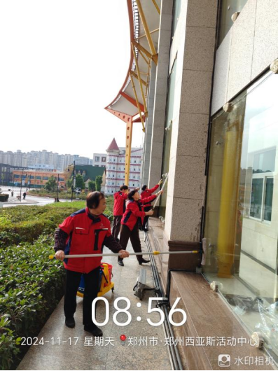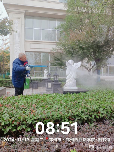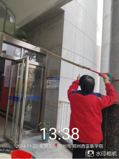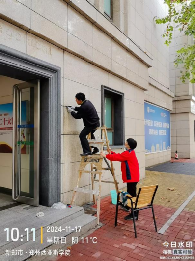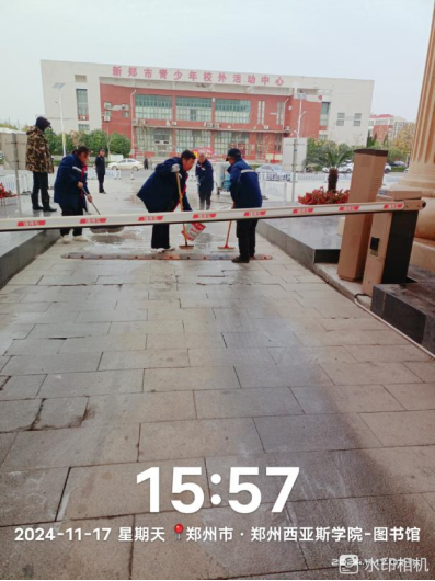 十六、对校园环境进行了12号楼除胶、综合馆玻璃清洁、北门地面冲洗、教学楼高空除尘、水系清洁、室外公共卫生间清洁、雕塑冲洗等工作。