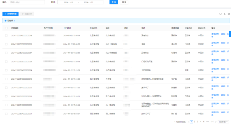 一、11月16日-11月22日17:40,客服部共接到1133条报修并及时安排人员处理。