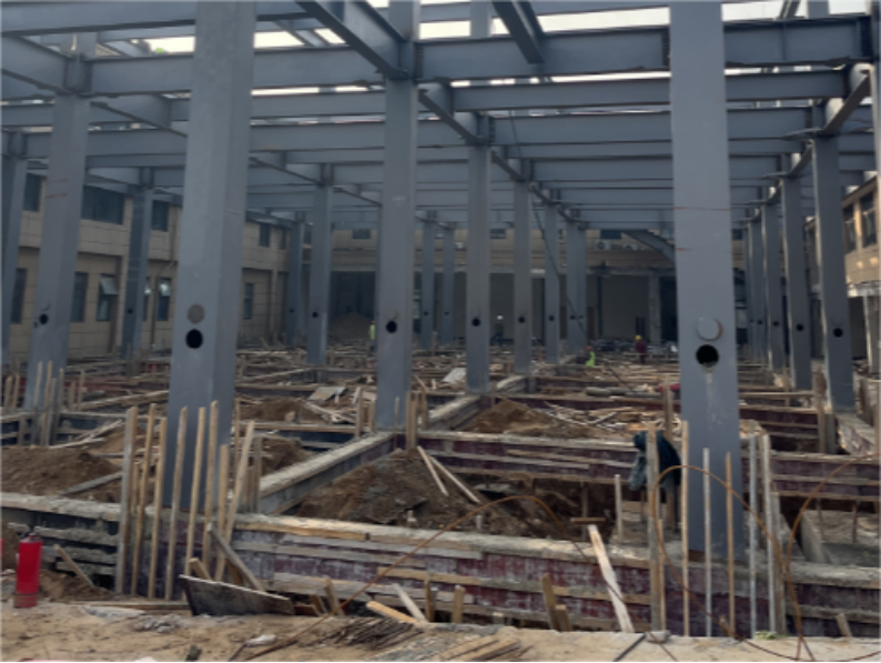 三、工程实训中心工程:钢结构细节调整;地梁浇筑完成。