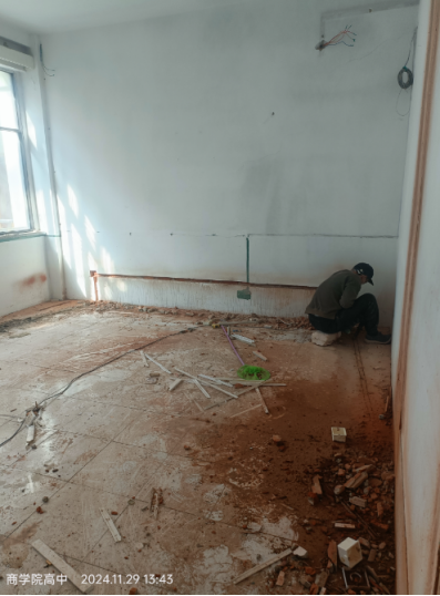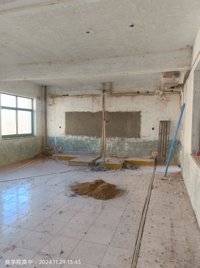 七、高中教室改造:一层办公室涂料完成,开关插座及灯具安装完成;2-4层教室开槽布管完成80%,其余交办公室开槽完成50%。