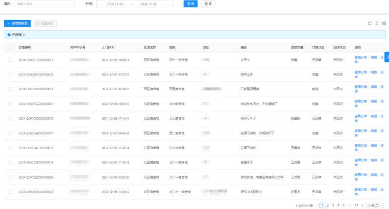 一、11月30日-12月06日18:20,客服部共接到902条报修并及时安排人员处理。