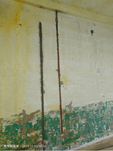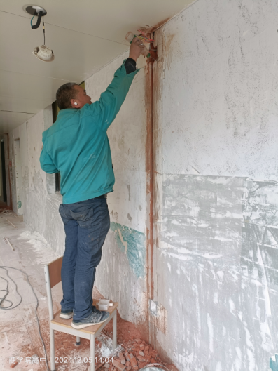 五、高中教室改造:一层办公室大厅石膏板吊顶完成40%,墙板基层拆除完成。2-4层教室及办公室开槽布管完成、穿线完成,其余未移交实验室、机房及办公室未施工。走道墙面基层铲除完成80%,墙面线槽粉刷完成90%。