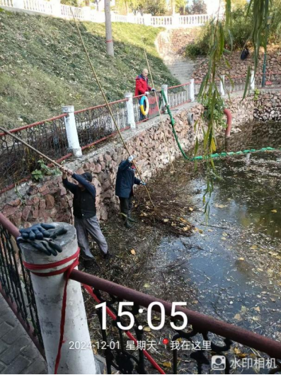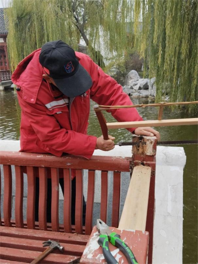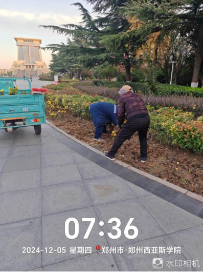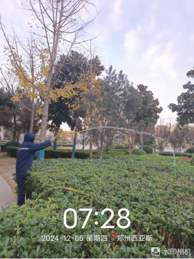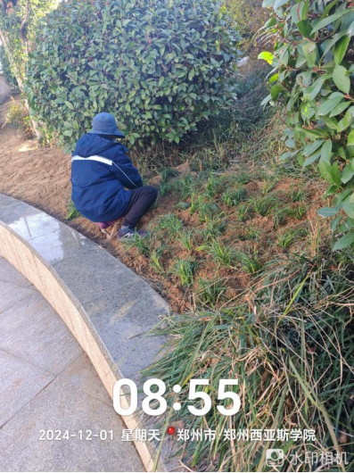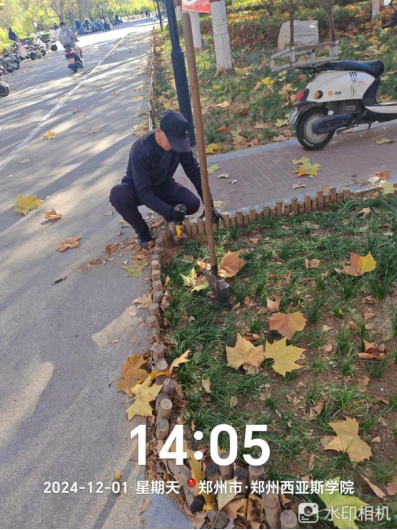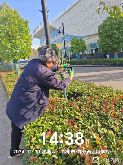 十七、对校园绿化进行了滴灌带安装、绿化斑秃区域栽苗、苗木修剪、清理干枯草花、落叶清理、日常浇水养护、修整绿化防护木桩、制作安装绿化防护围栏等工作。