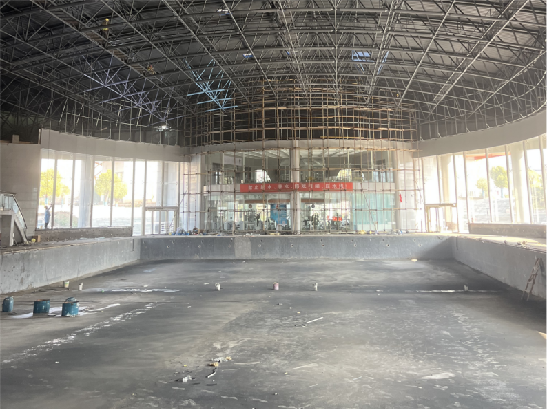 四、游泳馆改造项目:屋面球架底漆完成,面漆打样板;卫生间一遍防水完成,石材钢架完成50%;钢结构立柱打磨,窗台立板拆除完成。