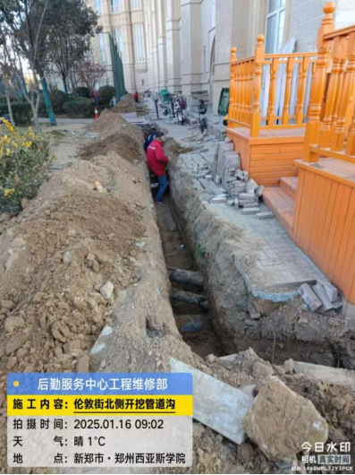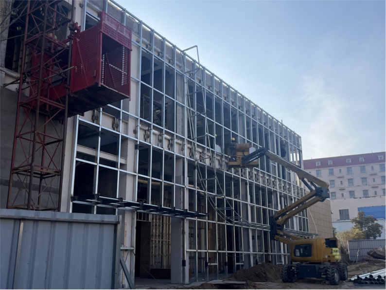 二、工程实训中心工程:外幕墙钢架完成,进行细部打磨;一层木龙骨基层完成60%;二层木龙骨基层完成30%;消防,空调安装管道完成;室外主电缆进场,开始敷设。