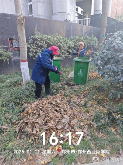 十二、对校园环境进行了垃圾桶擦拭、地面冲洗、大型垃圾桶洗刷、东六松针清洁、歌剧院清洁、河道两侧清洁、活动中心清洁、绿化带落叶吹清等工作。