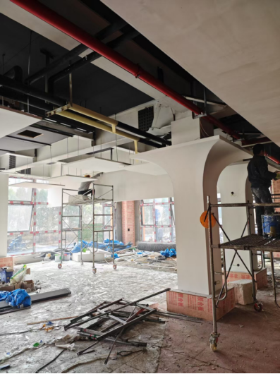 三、工程实训中心工程:室外人行道景观挡土墙砌筑完成;一层成品板安装完成95%,进行细部收尾;二层木工完成90%,成品隔断下料。