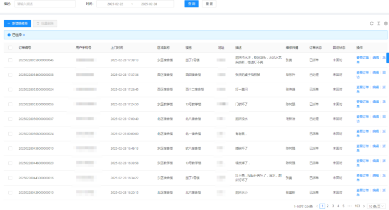 二、02月22日-02月28日18:00,客服部共接到1024条报修并及时安排人员处理。