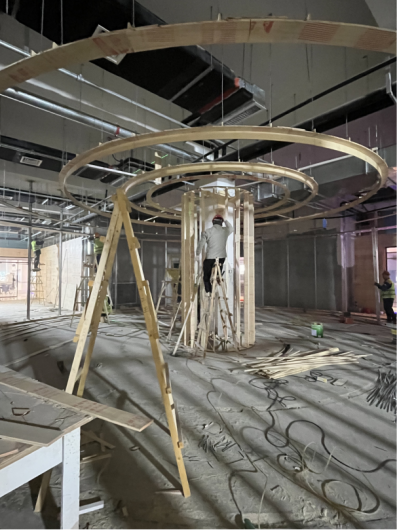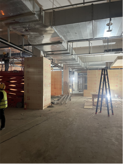 六、19号楼一层展厅装饰项目:钢骨架本周全部完成;展板木工阻燃板已完成80%;水电同步木工进行预埋;顶部乳胶漆开始进场施工。