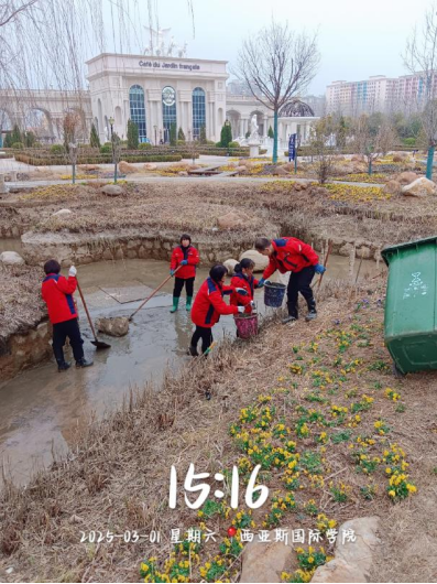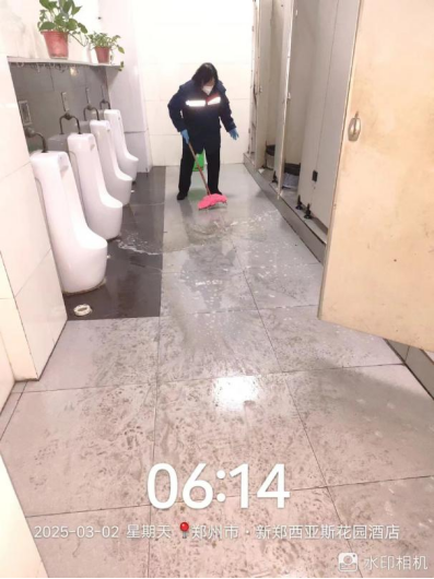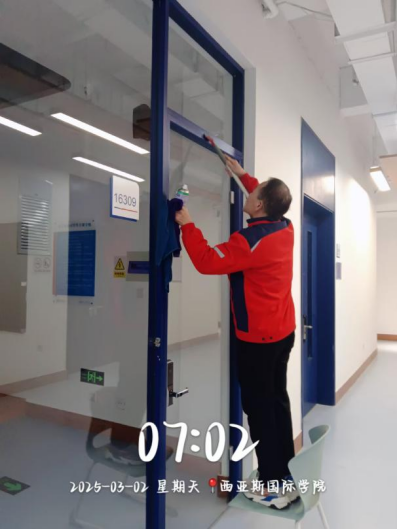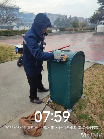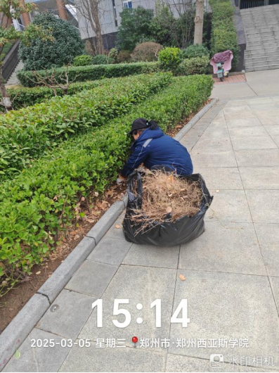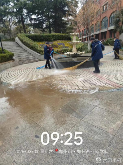 十四、对校园环境进行了16号楼挑檐清洁、垃圾桶擦拭、地面冲洗、法国园人工湖清洁、室内3米以下附属物清洁、图书馆地垫清洁、公共卫生间清洁、雨水篦子清洁等工作。