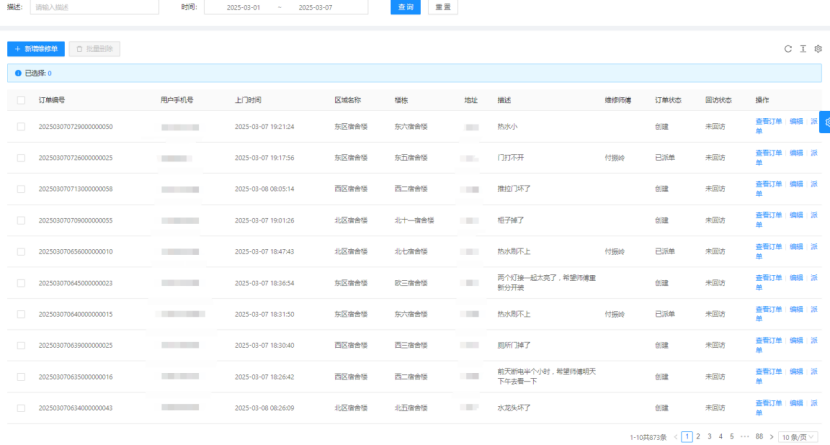 一、03月01日-03月07日19:30,客服部共接到873条报修并及时安排人员处理。