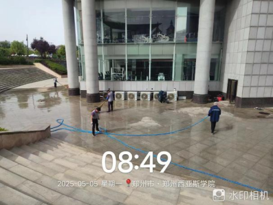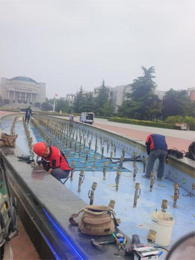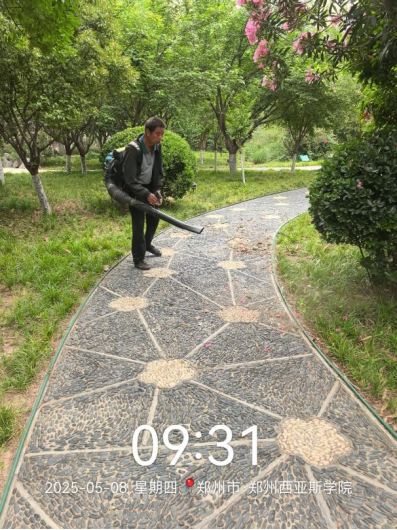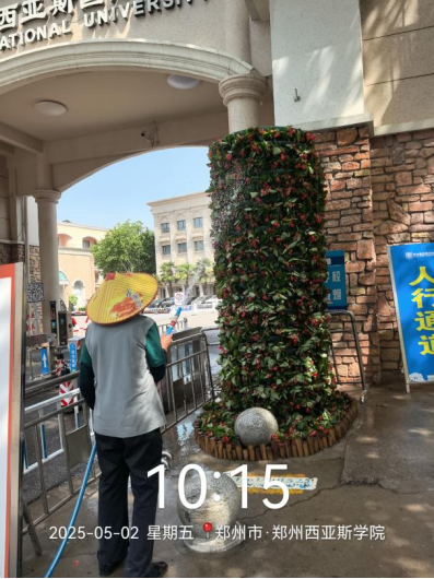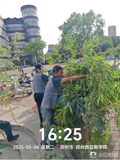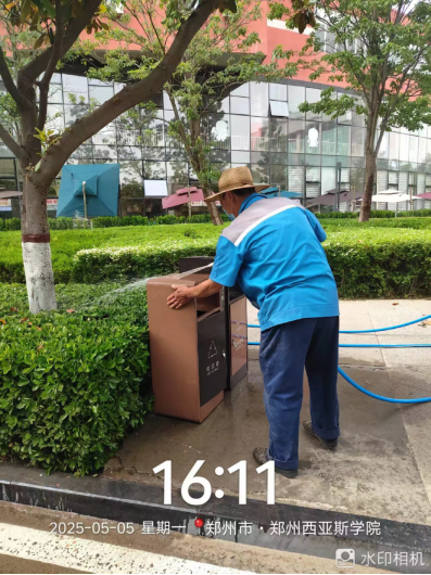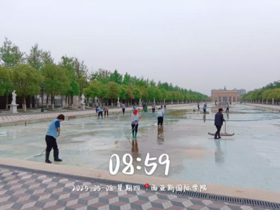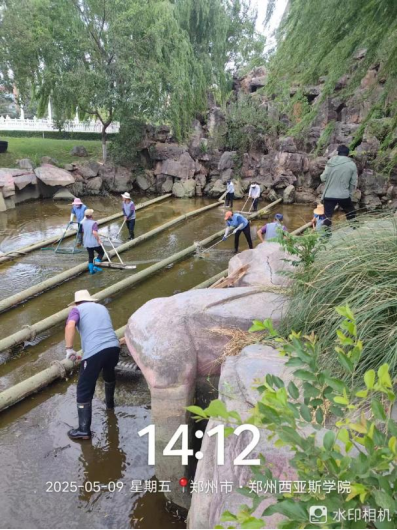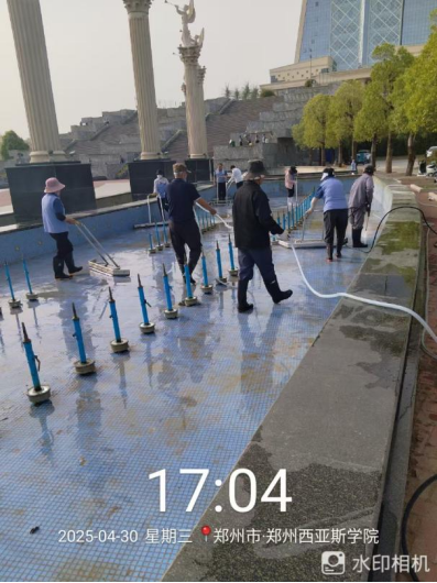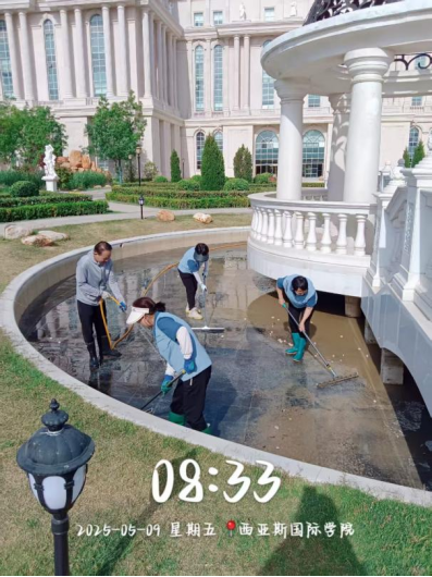 十二、对校园环境进行了宝北水系清污、地面污渍冲洗、16号楼玻璃幕墙清洁、法国园水系清污、清吹落叶、喷泉广场水系清污、行政楼西侧人工湖清污、垃圾桶冲洗等工作。
