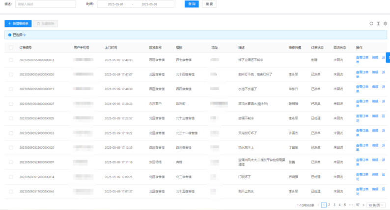 一、05月01日-05月09日17:50,客服部共接到963条报修并及时安排人员处理。