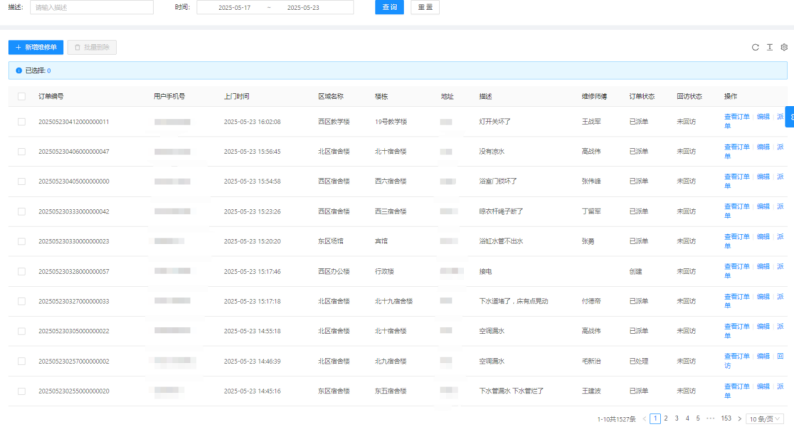 一、05月17日-05月23日16:00,客服部共接到1527条报修并及时安排人员处理。