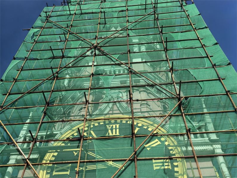 八、莫斯科红场塔楼维修工程:主塔钢管脚手架搭设完成,安全网维护到位;主塔拆除完成10%。
