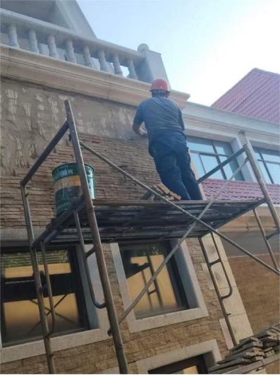 六、创业中心北立面外墙工程:真石漆底涂喷涂全部完成;开始拆除钢管脚手架。