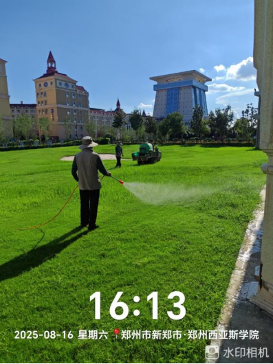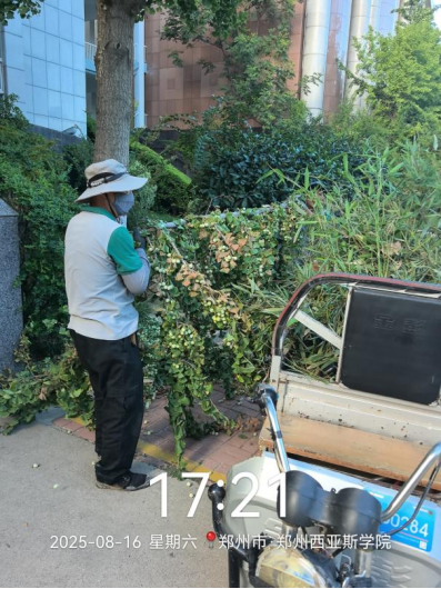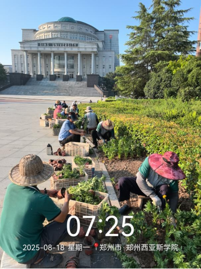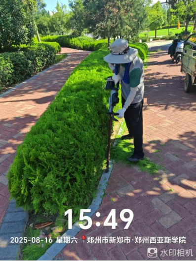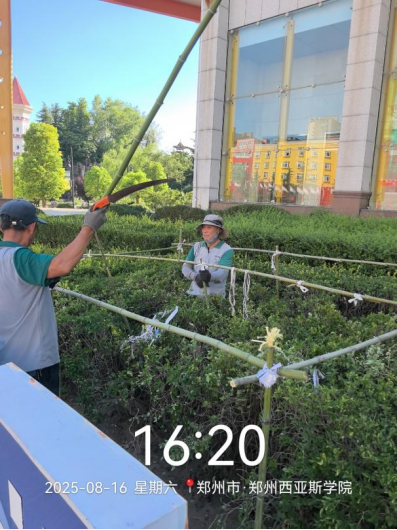 十八、对校园绿化进行了病虫害打药、草花栽种区域整理、除草剂打药、搭建新栽苗保护遮阳网、绿篱修剪、干枝断枝清理、杂草清理、栽种草花等工作。