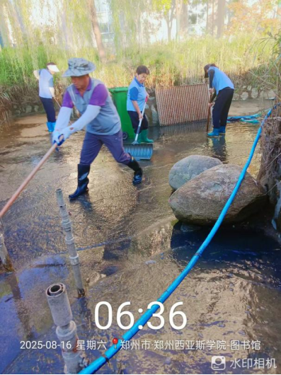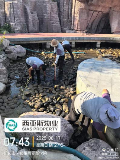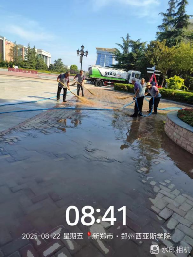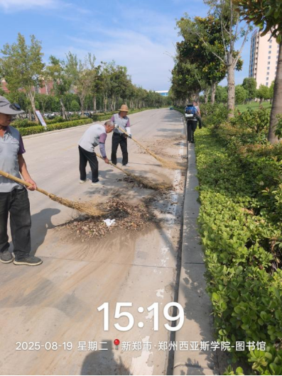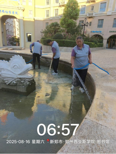 十九、对校园环境进行了地面污渍冲洗、高空除尘、清吹车棚、清吹落叶、森林公园南侧喷泉清洁、法国园人工湖清洁、西班牙广场喷泉清洗、3米以下附属物清洁等工作。