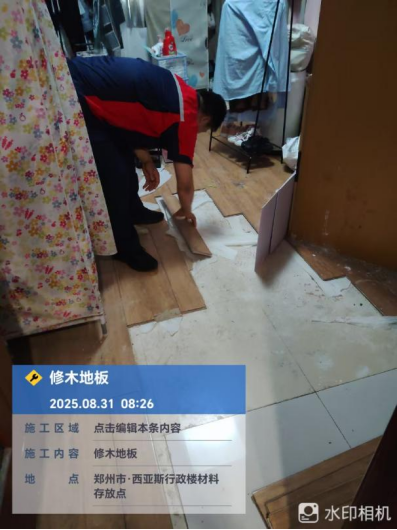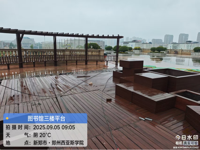 二、图书馆三楼平台修复工程:防腐木地板龙骨以焊接完成100%;花箱吊装完成100%;防腐木地板安装完成50%;破处垃圾清理完成90%;基础破处完成100%。