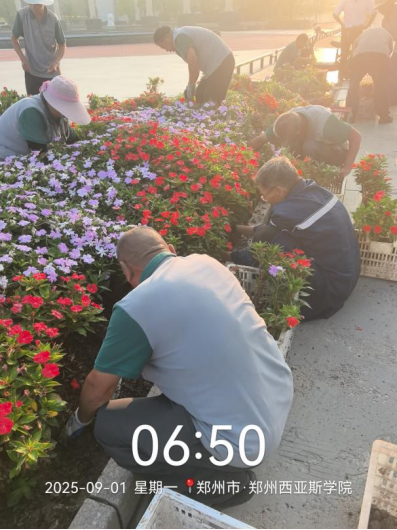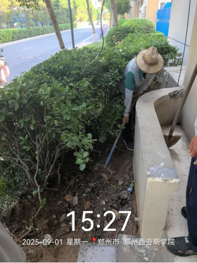九、对校园绿化进行了草花栽种、绿化空白区域栽种麦冬、绿篱修剪、乔灌木修剪、月季固定、杂草清理、砖石瓦块杂物清理、草坪修剪后清理等工作。