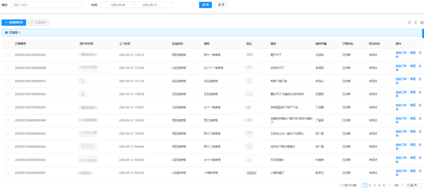 二、09月06日-09月12日17:20,客服部共接到1878条报修并及时安排人员处理。