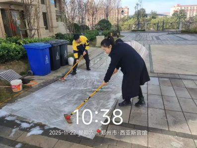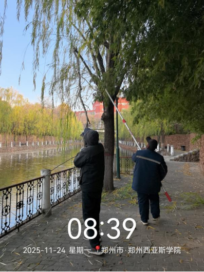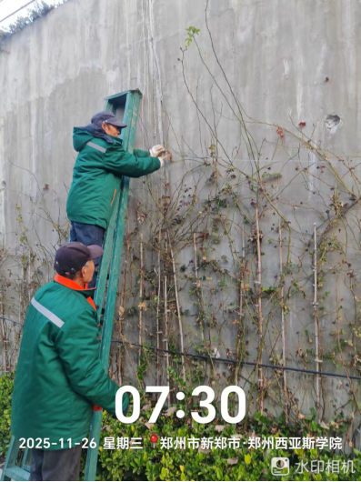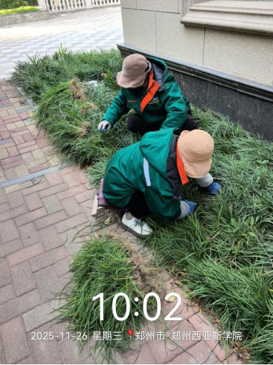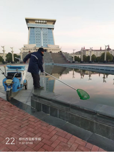十一、对校园环境进行了玻璃清洁、垃圾点位冲洗、地面污渍冲洗、保洁用品定位贴规范、落叶清扫、水系清洁、附属物清洁、高空除尘等工作。
