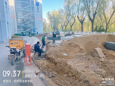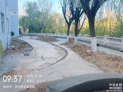 三、D04宿舍楼周边景观改造工程:广场铺装垫层完成;坐凳砌筑完成;排水沟及雨水管道完成;绿化给水完成。