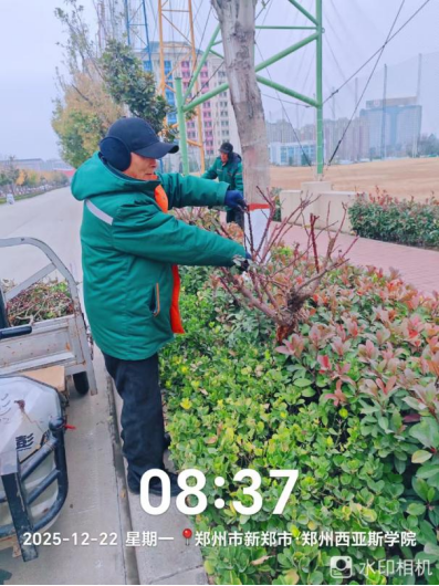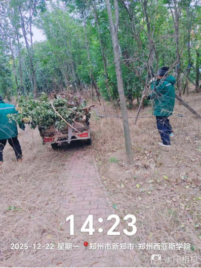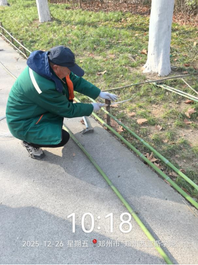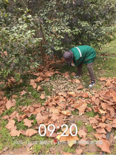九、对校园绿化进行了干枝断枝清理、花池整理整地、落叶清理、绿化防护围栏修整、苗木修剪、月季修剪、杂草清理、移苗补苗等工作。
