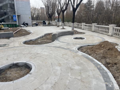 四、D4周边改造:花池土方平整完成50%;车行道路面土方平整完成40%;南侧自行车停车场平整完成100%。