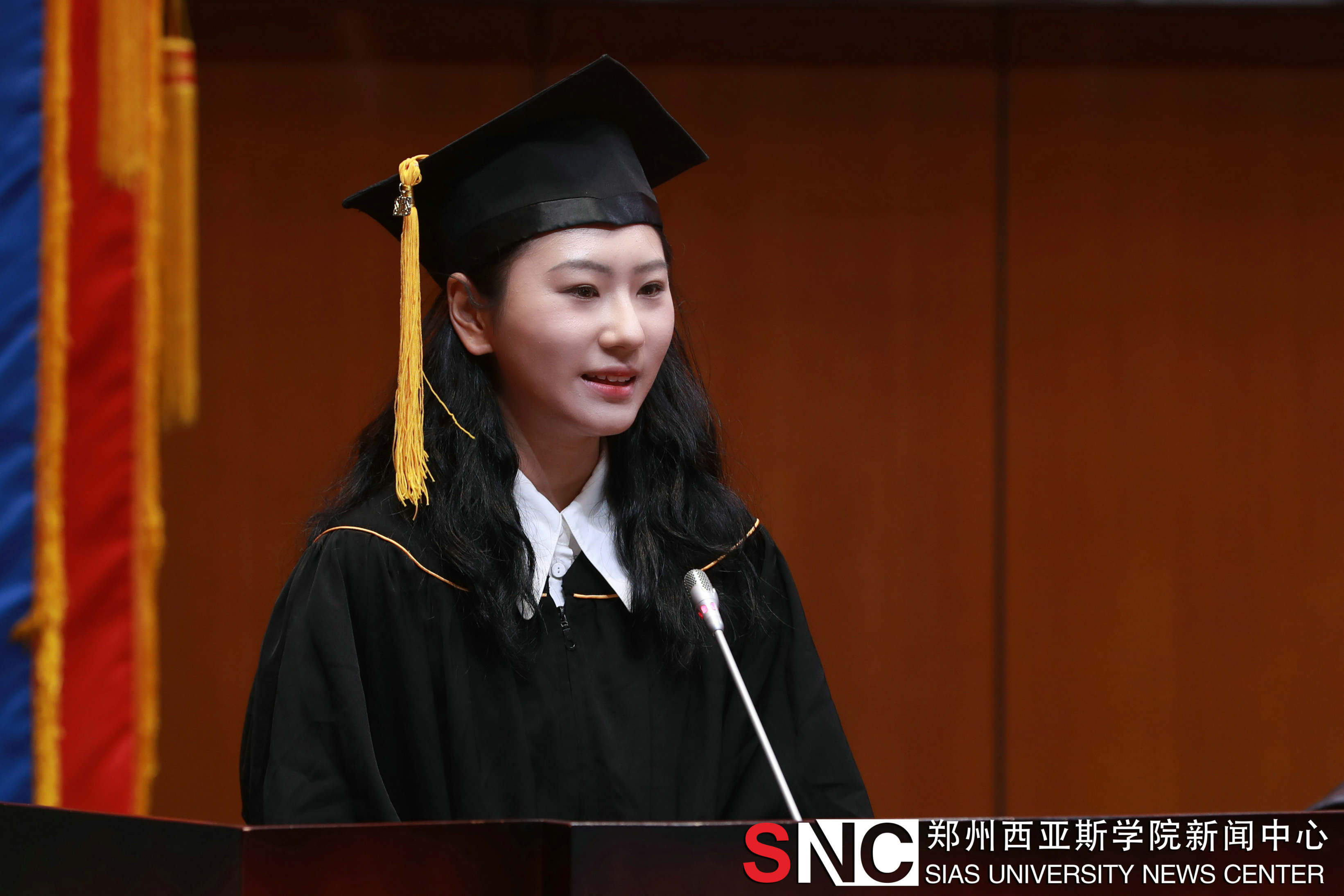 优秀毕业生代表严梓琦在发言中分享了大学四年来的点点滴滴和在西亚斯成长与收获,感谢学校领导和老师对自己的用心栽培,感谢在学校的指引下学习了更多的专业知识和技能,坚定了自己的人生理想和信念。