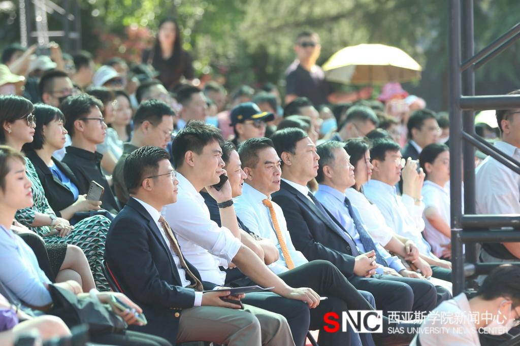 随后,访校日庆典仪式在歌剧院教学剧场隆重举行。河南省政协原副主席、党组副书记、河南慈善总会会长邓永俭,江南大学党委委员、副校长田备,河南省政协科教文卫委员会主任、原河南省文化厅厅长杨丽萍,河南省文化和旅游厅巡视员、副厅长康洁,河南省文化和旅游厅副巡视员秦曙光,河南省文物局党组成员、副局长贾连敏,河南省文物考古研究院院长刘海旺,河南省文物建筑保护研究院院长杨振威,河南省非遗保护中心主任楚小龙,河南省文化和旅游厅非遗处处长祝欣,河南省文化馆馆长冯莉,河南方大咨询有限公司董事长李宗峰,河南迅达教育董事长张东朋,河南省小草教育基金会发起人孔祥平、副理事长王正君,中国电信教科部总经理王恩林,中国移动郑州分公司市场部总经理杨光,中国联通郑州分公司总经理王硕,优秀校友代表、好想你健康食品股份有限公司副总经理、董事会秘书豆妍妍,各国际大学代表,西亚斯集团代表和校友会代表等受邀出席庆典。我校创办人、理事长陈肖纯博士,党委书记马建生,党委副书记、纪委书记李华峰,副校长赵予新,副校长许圣道等校领导出席庆典。庆典仪式由马建生主持。