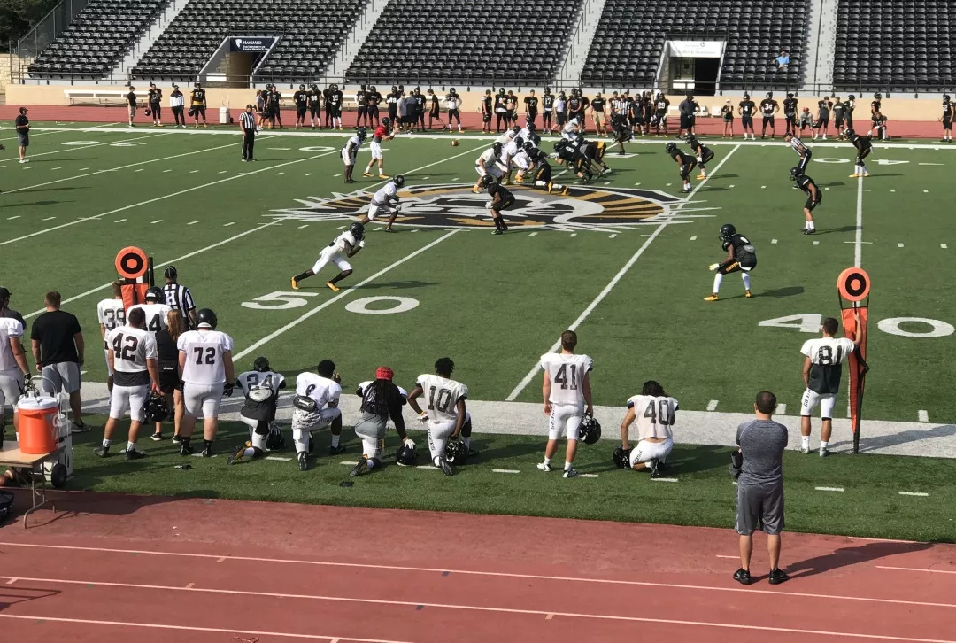 (图为赴外学习教师近距离观看橄榄球队训练)