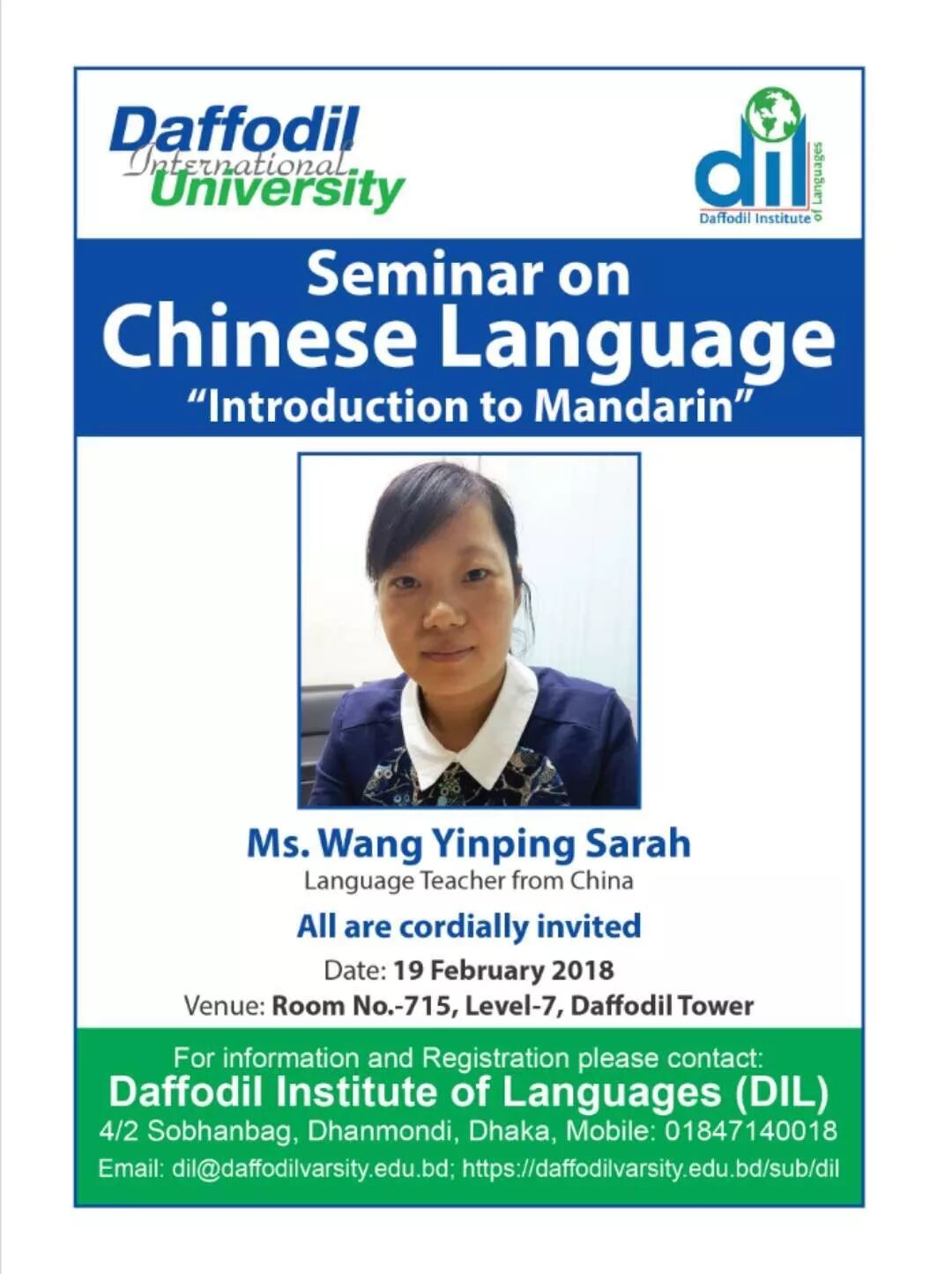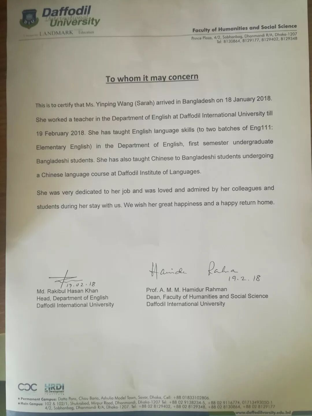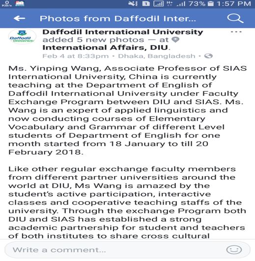 作为郑州大学西亚斯国际学院的一名青年教师,我于2018年1月18日—2018年2月21日到孟加拉国的Daffodil International University 进行访学。虽然只有短短一个多月,但回顾这段经历,收获颇多,感慨万千,这段经历也将成为我人生道路上一笔宝贵的财富。