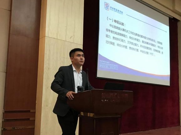 本次讲座的主讲人为张喜峰老师,拥有多年公职考试培训教学经历,培训考生近万名,积累了丰富的教学经验。讲座有序进行,并给到场学生发放学习资料。该讲座张老师分别就“职业规划”、“应届生参加公考优势”和“申论重难点”这三个要点进行了细致的分析与讲解,在讲座过程中细致严谨,授课风趣,课堂氛围活跃,让同学们在轻松的氛围中学习,讲座最后在张老师对学生的祝福中结束。