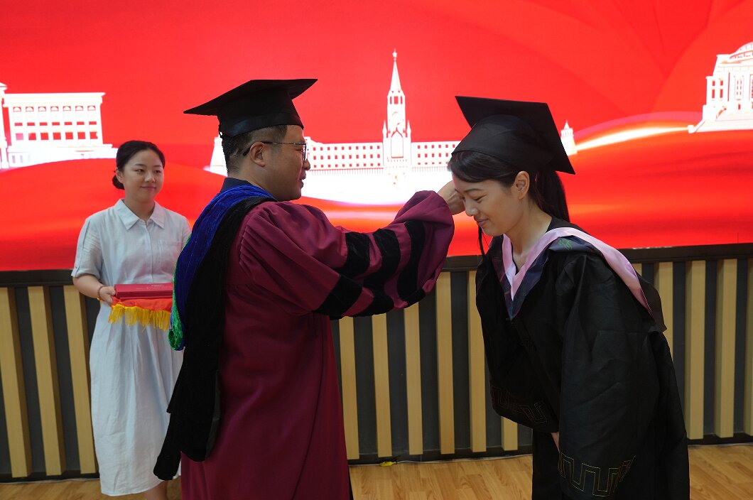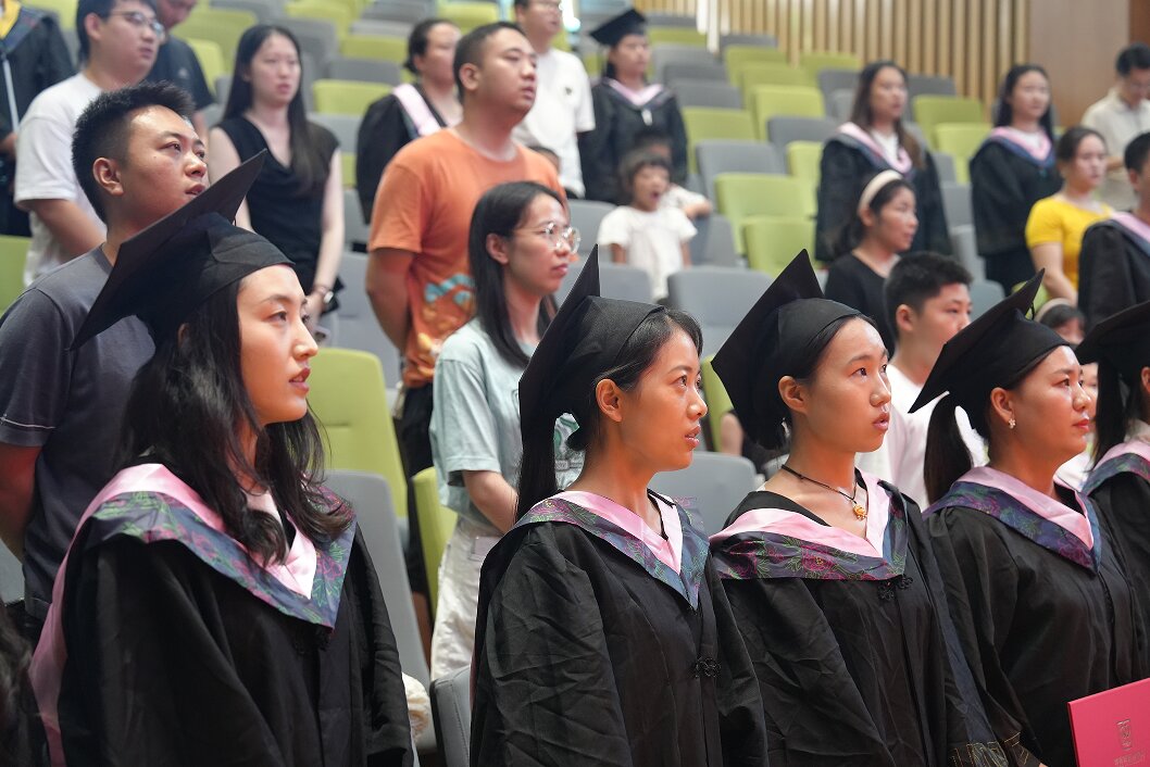 在庄重的乐曲中,吴华书记为毕业生代表行拨穗礼并颁发学位证书。流苏从右至左的瞬间,象征着学子们从求知者到践行者的身份蜕变。