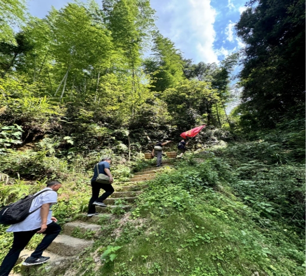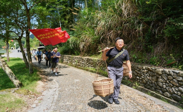 7月25日上午,按照实践教学研修活动安排,思政课实践研修班全体成员来到了著名的“朱毛红军挑粮小道”旧址。大家拿起扁担,挑起箩筐,沿着 90 多年前朱毛红军走过的挑粮小道, 在近40 度高温闷热天气中前行,学员们挥汗如雨,浑身湿透,但仍然坚持走完了两公里多长的“挑粮小道”体验路段,亲身体验了当年红军战士挑粮上山的艰苦生活,深切感悟了革命前辈不畏艰难困苦、不怕流血牺牲的革命精神。