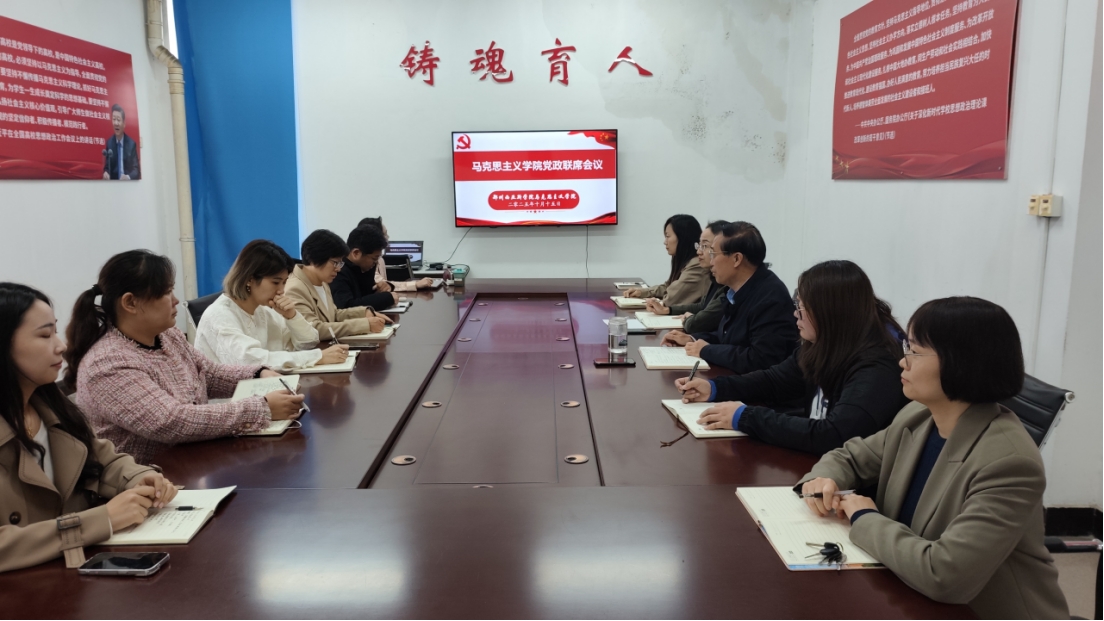 2025年10月15日上午,马克思主义学院在2-406会议室召开了秋季学期党政联席会议。会议由学院院长郭学德主持,党总支副书记张前,学院党总支委员、基层支部书记及教研室主任参加了此次会议。会议的主题是:安排部署秋季学期学院主要工作;研究推荐学院思政课教师党员发展对象。