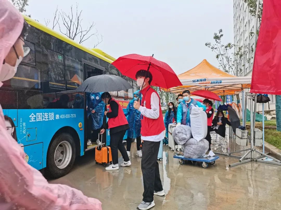 今日小雨,志愿者们穿着雨衣坚持在迎新工作第一线,雨水和汗水从脸上滑落也无暇顾及,只为让新生感受到“一站式”学生社区这个大家庭的温暖。大家以饱满的热情去迎接新生,耐心地与家长沟通开学防疫要求,冒雨为新生搬运行李,在新生办理入学手续必经的各个地点耐心等待以及提供帮助。