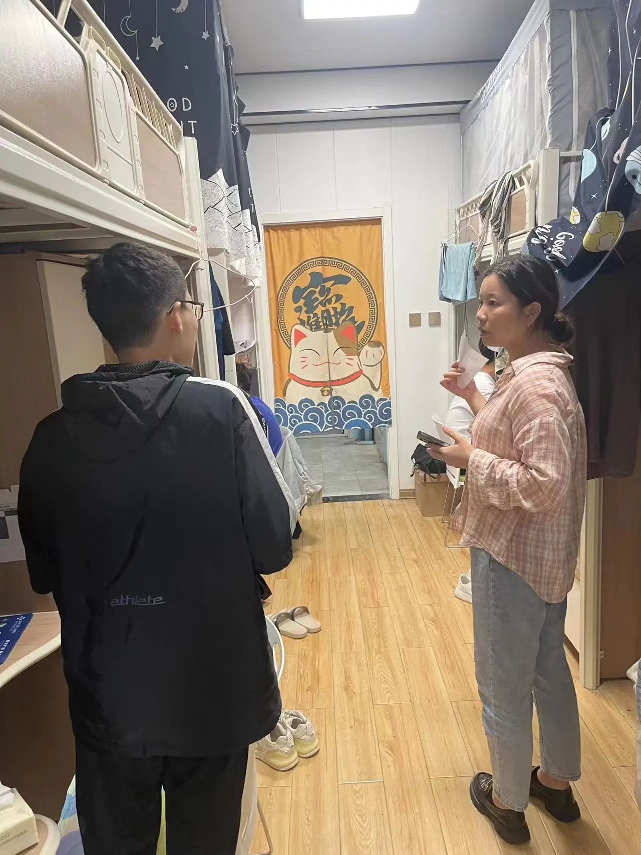 新学期伊始,为迎接学生归来同时了解学生到校情况,强调宿舍卫生、安全等问题,进一步做好“一站式”学生社区新学期管理工作,保障学生身心健康和安全。2023年8月27日晚7点半,“一站式”学生社区党总支副书记刘东伟带领全体育人导师开展宿舍走访活动。