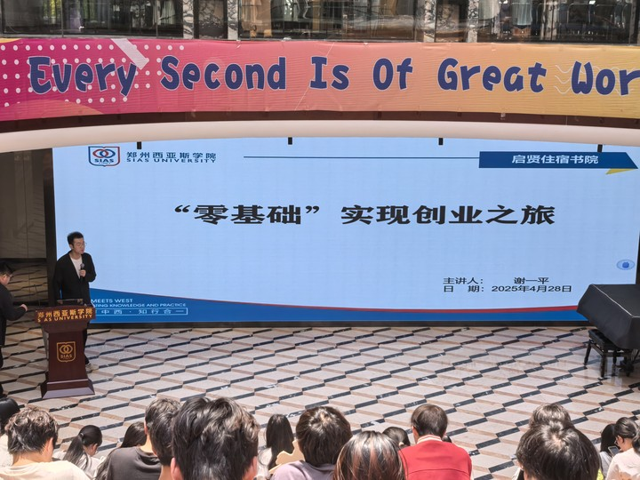 4月28日,由郑州西亚斯学院主办、启贤住宿书院承办的免费午餐讲座在16号楼一楼下沉式报告厅举行。本次讲座聚焦《“零基础”实现创业之梦》,邀请我院KAB创新创业社团社长谢一平担任主讲人。学生主管王晓蕾、全体育人导师及100余名师生到场参加。