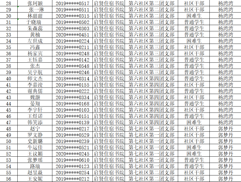 启贤住宿书院根据《关于做好2021-2022学年家庭经济困难学生认定工作的通知》要求,为保证我院本年度家庭经济困难学生认定工作顺利开展,特成立以社区团支部为单位的民主评议小组。现将名单公示如下,公示期为9月13日--15日,如有异议请于9月15日前反馈至北21号宿舍楼B007办公室王老师处,办公电话:0371-62600932。