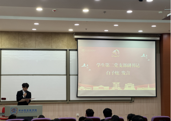 转正党员代表陈奕晓、白子炫、武俊发言。陈奕晓表示将深化理论学习,提高政治站位;白子炫分享社区志愿服务经历,承诺投身社会实践;武俊结合学生会工作,表态提升服务同学能力。
