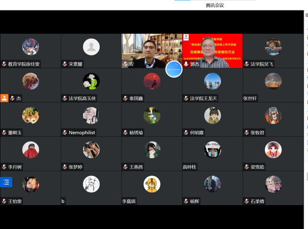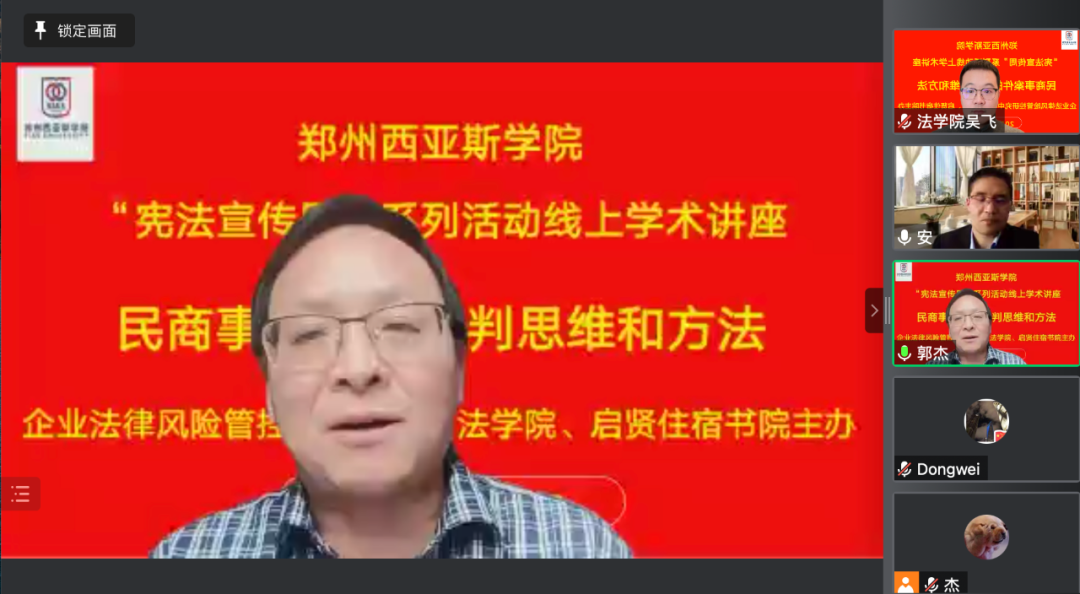 为认真学习宣传贯彻党的二十大精神,深入贯彻习近平法治思想,推动全省教育系统学习宣传宪法,弘扬宪法精神,维护宪法权威,增强全院师生的法制观念,提高学生的法律意识和自我防范意识,打造文明守纪的和谐校园。根据省教育厅 2022 年全省教育系统 “宪法宣传周”工作安排,结合学校领导工作部署,我校法学院、企业法律风险管控研究中心、启贤住宿书院于2022年12月1日在腾讯会议举办“宪法宣传周”系列活动第一场线上学术讲座。此次讲座由法学院郭杰教授主持,出席的领导有法学院院长王龙天、启贤住宿书院党总支副书记刘东伟、招生办公室主任兼法学院合格评估助理朱红强、法学院办公室主任吴飞、启贤住宿书院分团委书记冷炎以及副书记黄影。