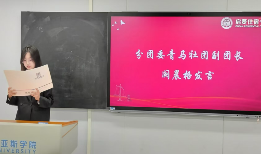 最后,青马社团副团长阙晨格对后续“青马工程”课程安排做出大致介绍,她表示通过青马工程班的培训,同学们不仅能够提高自己的综合素质和能力,还能够更好地肩负起时代赋予的历史使命和社会责任。希望同学们在今后的学习生活中,能学有所获,牢记“空谈误国,实干兴邦”的教诲,脚踏实地做实事,让奋斗的青春更显底色。