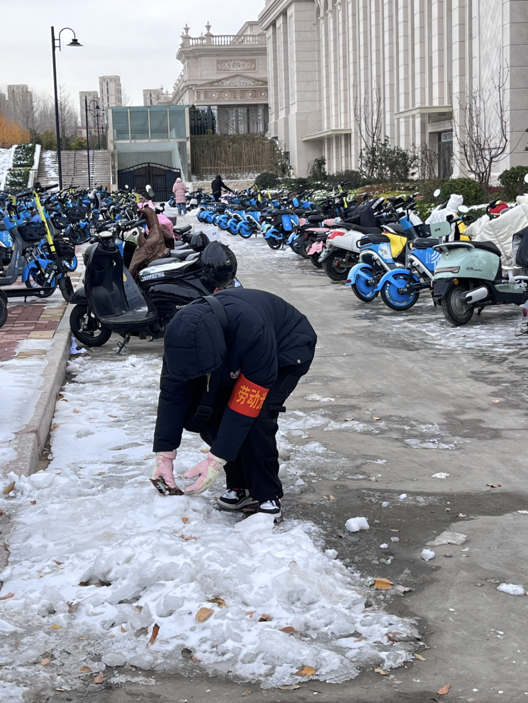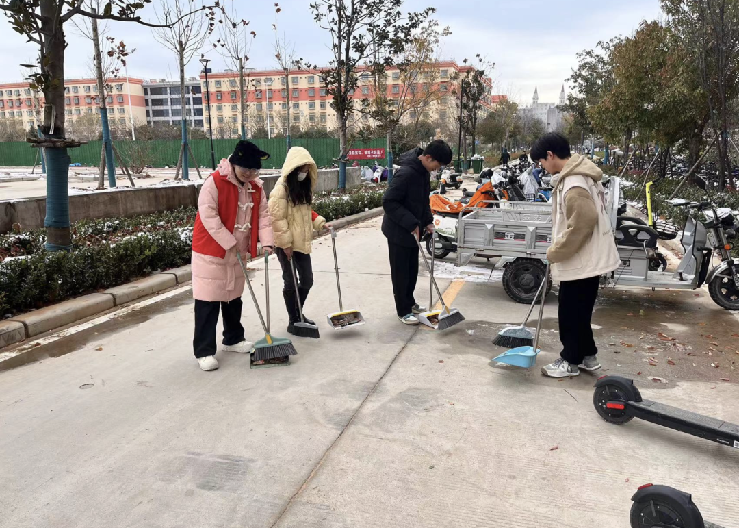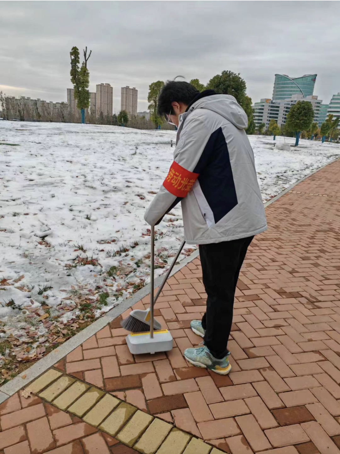 在打扫现场,志愿者同学们不畏严寒,个个都充满干劲,积极发挥奉献精神,他们拿着扫帚、垃圾袋等工具,认真清理起路边的垃圾,用手拾起雪堆中残存的落叶,乱停乱放的共享电车也在同学们的努力下陆续回归原位。